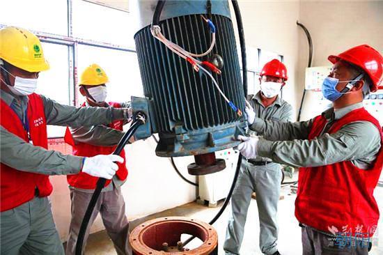 原200千伏安的變壓器被吊下配變臺架,新調來的315千伏安的變壓器平穩(wěn)地落座在配變臺架上……通過近4個小時的安裝、調試,接通10千伏千畝湖支線等一系列的緊張作業(yè)。19時02分,2臺先期安裝好的55千瓦的水泵成功發(fā)起,兩股水流沖出千畝湖,流向遠方。